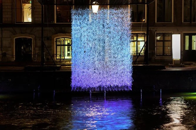 The first thing I noticed was the hush — just water lapping and this gentle hum from the electric boat as we drifted under a bridge near Het Scheepvaartmuseum. Lights everywhere, but not harsh, more like someone scattered lanterns across the water. Our skipper, Joris, grinned and pointed out a sculpture that looked like tangled neon roots. He called it “Legacy,” which is apparently the theme this year. I tried to get a photo but honestly, it’s better in motion than on my phone.