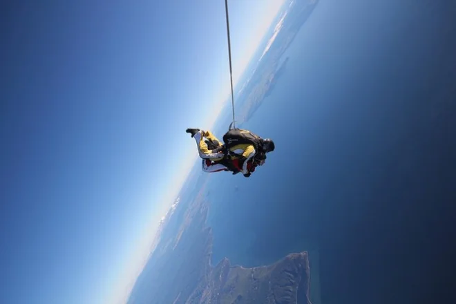 Skydiving above lake taupo with views of volcanoes and wild laughter