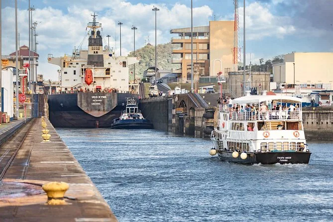 Your day includes check-in at Flamenco Marina in Panama City, all cruising aboard the spacious Pacific Queen with open-air or air-conditioned decks as you pass through Miraflores and Pedro Miguel Locks, an all-you-can-drink coffee station plus sodas and water throughout, lunch served onboard as you cross Miraflores Lake toward Gamboa—with professional bilingual guides sharing stories before your return coach ride back to town.