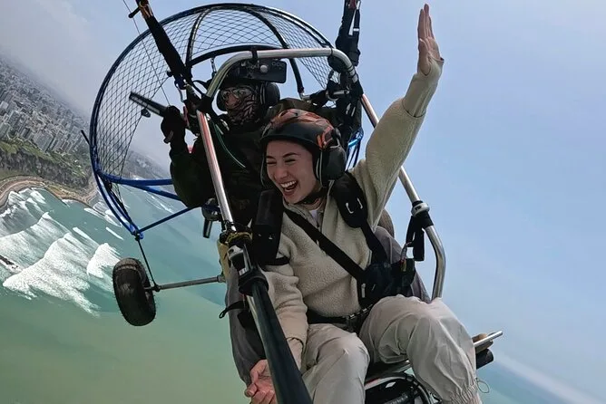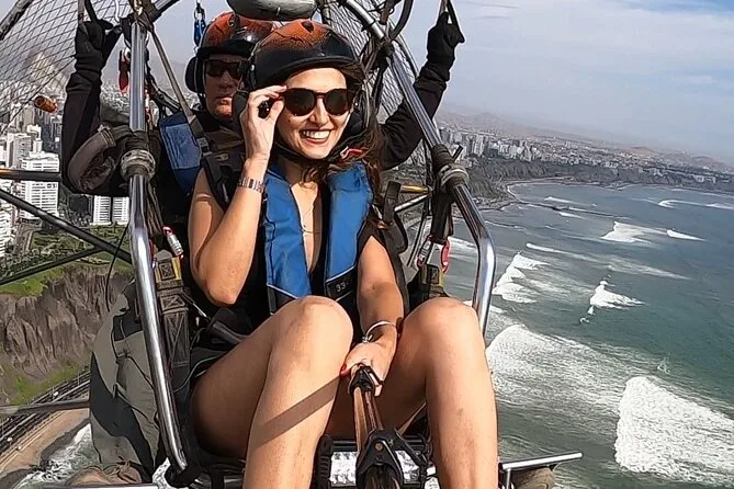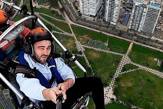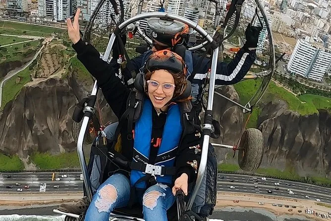 Takeoff was smoother than I expected — one second we were rolling, then suddenly Miraflores and San Isidro were dropping away beneath us. The city looked like a patchwork quilt, all those rooftops and parks stitched together by busy roads. Our guide pointed out surfers bobbing in the gray-green water and tiny buses crawling along the highway. The air up there felt cooler, almost sharp against my cheeks. At some point Michael let me try steering for a second (don’t worry — he kept his hands close), and I probably veered left too hard because he laughed and shouted over the wind, “Easy! Like riding a bike.”