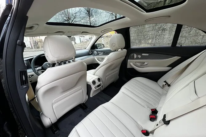 You’ll ride in either a Mercedes E Class sedan or Mercedes V Class minivan.