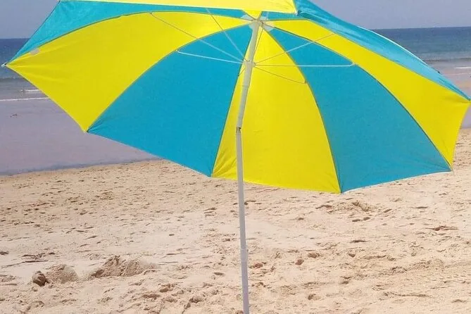 Your day includes van transport with air conditioning from Faro train station, a local guide who leads hikes along four scenic Algarve spots (Praia da Marinha cliffs, Benagil Cave viewpoint, Algar Seco caves, Senhora da Rocha), use of a diving mask if swimming is possible at Praia Nova Beach, plus umbrellas if needed—just remember to pack your own snacks and water.