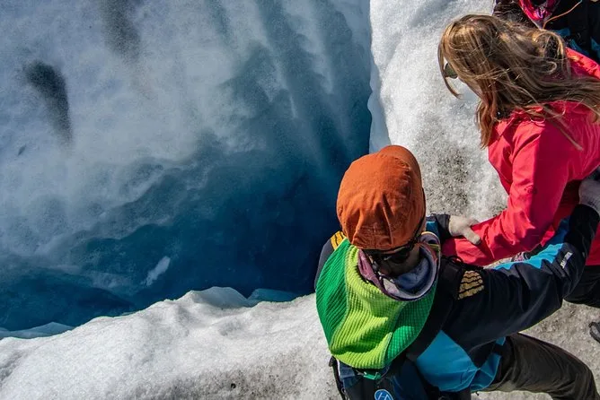 O minitrekking durou cerca de uma hora e meia no gelo. É uma sensação estranha perceber que você está andando sobre algo tão antigo — às vezes o gelo é áspero, outras vezes liso como vidro. Sofía mostrou pequenos riachos em canais turquesa fluorescente e explicou como o glaciar avança, diferente da maioria que está derretendo. Paramos perto de uma fenda estreita — “pise aqui, não ali” — e ela contou sobre a grande ruptura que acontece a cada poucos anos. O silêncio entre os ventos era impressionante, só quebrado pelo som das botas e alguém à frente murmurando “uau”.
