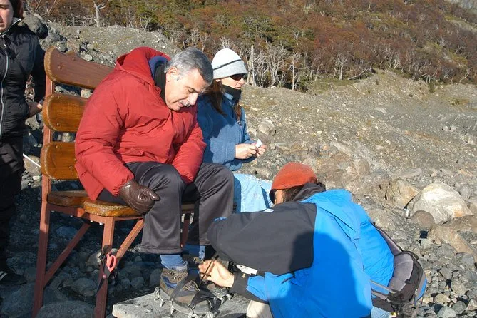 Os crampons são fornecidos pelos guias antes de pisar no gelo; recomenda-se usar botas resistentes.