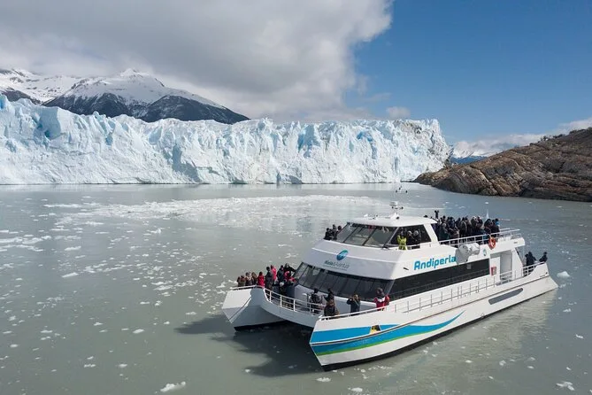 Seu dia inclui transporte de ida e volta do hotel em El Calafate, caminhadas guiadas pelas passarelas cênicas de Los Glaciares com um guia local profissional que conta histórias pelo caminho, transporte confortável de ônibus pelos cenários da Patagônia e, se quiser, passeio de barco opcional — o almoço fica por sua conta, com vista para o imponente glaciar.