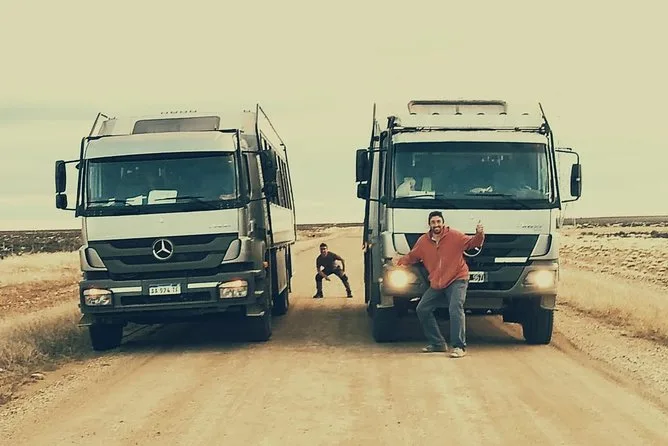O passeio é feito em caminhões 4x4 grandes, preparados para estradas asfaltadas e de terra na Patagônia.