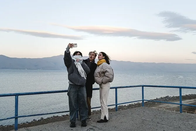 Depois seguimos para o ar mais fresco rumo ao Lago Sevan. A estrada subia em curvas até meus ouvidos estourarem — afinal, Sevan fica quase a 2.000 metros de altitude. O lago é enorme, azul-esverdeado sob nuvens que mudavam o tempo todo, cercado por montanhas que ainda tinham neve no topo, mesmo sendo junho. Subimos até o Mosteiro Sevanavank na península (muitos degraus — minhas pernas reclamaram, mas valeu a pena). A vista lá de cima não sai da minha cabeça: as cúpulas do mosteiro recortadas contra uma água tão vasta que não dá para ver o fim. Uns meninos locais jogavam pedras na água perto dali; um deles acenou para a gente como se fôssemos velhos amigos.
