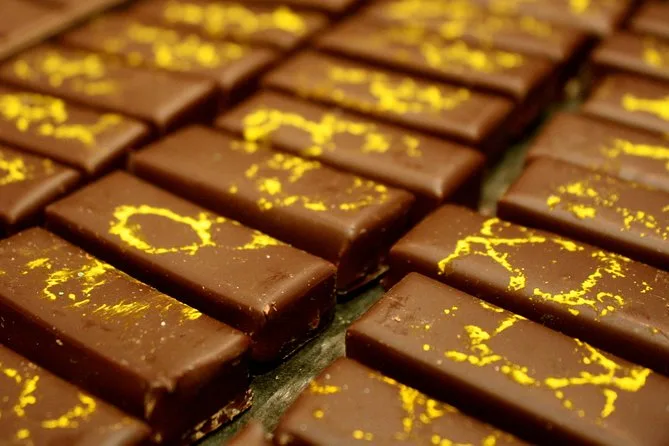 O tour oferece várias degustações de chocolate, além de queijo, embutidos, batatas fritas para compartilhar e água — o suficiente para uma refeição leve junto com as bebidas.