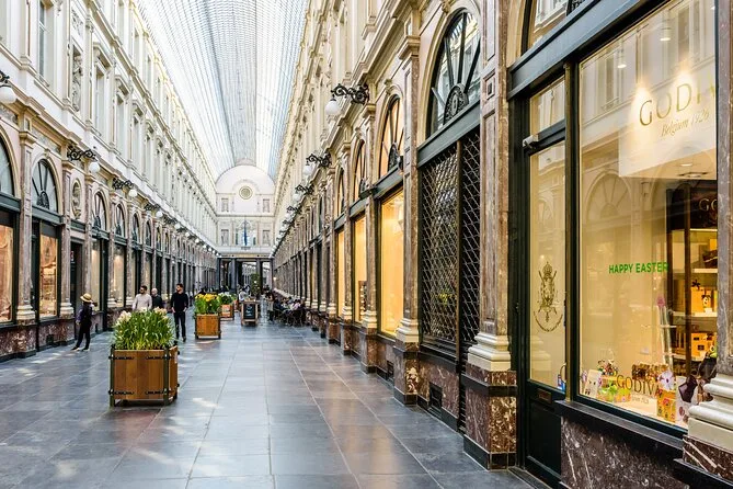 Logo que entrei nas Galerias Reais Saint Hubert, percebi como o cheiro de chocolate parece pairar no ar — não é forte, mas você sente quando alguém abre a porta de uma loja. Nossa guia, Sophie, nos chamou para a Neuhaus (ela disse que era “a original”) e distribuiu pequenos quadradinhos que derretiam antes mesmo de eu conseguir descrever o sabor. Tem algo especial em comer chocolate no lugar onde ele foi criado, que faz você desacelerar. Fiquei olhando para o teto de vidro e quase esqueci que também estávamos ali para conhecer a cidade.