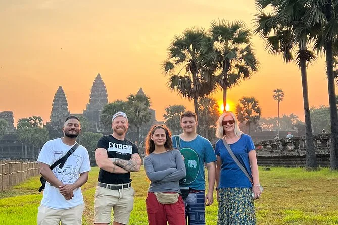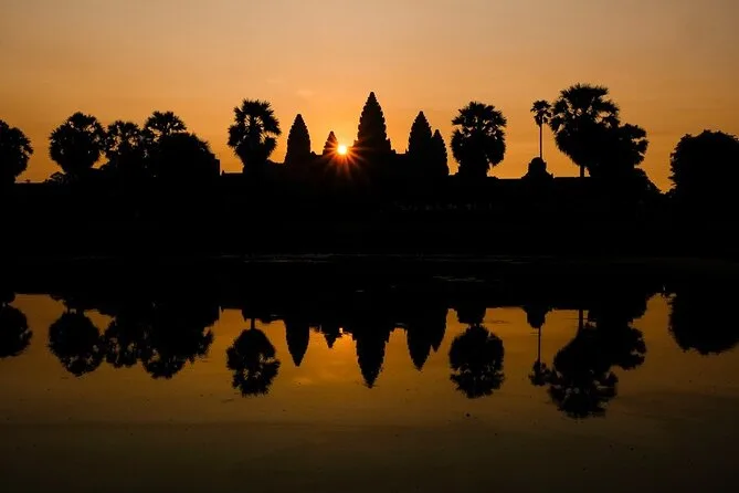 O tour começa antes do amanhecer com transporte do hotel para chegar a tempo do nascer do sol em Angkor Wat.