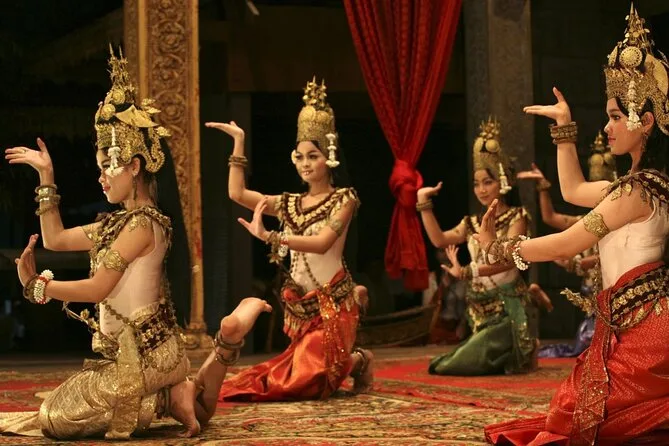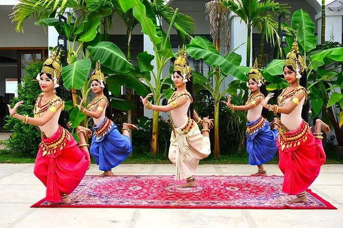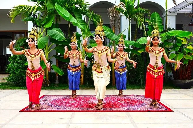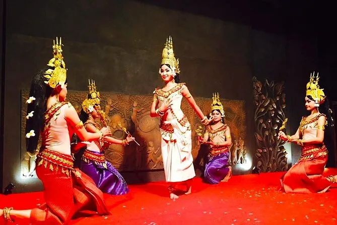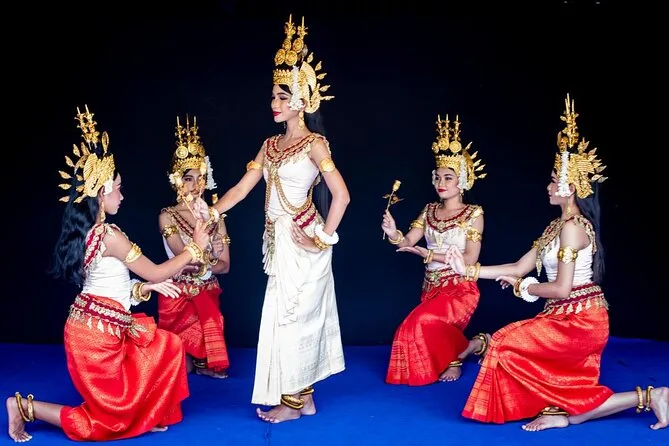 Sua noite inclui transfers de tuk-tuk ida e volta do hotel em Siem Reap, jantar cambojano com quatro pratos (incluindo sobremesa) e assentos reservados para cinco apresentações tradicionais de dança — tudo organizado para você relaxar e aproveitar cada momento.