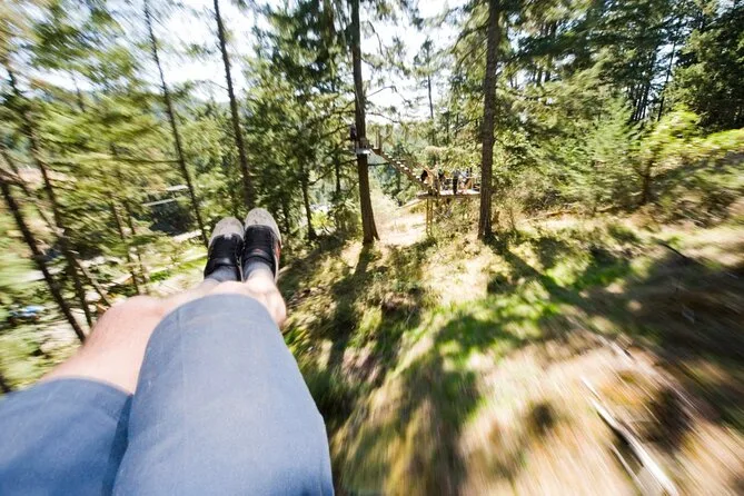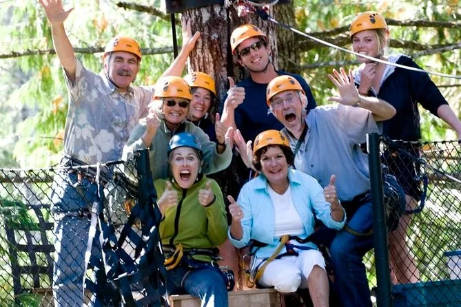 Seu dia inclui transporte ida e volta se selecionado na reserva, todo equipamento de segurança ajustado pela equipe na chegada, um percurso guiado de duas horas pelas tirolesas na copa da floresta da Ilha de Vancouver com oito linhas e uma ponte suspensa — tudo conduzido por guias locais experientes que contam histórias durante o trajeto.