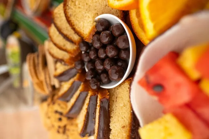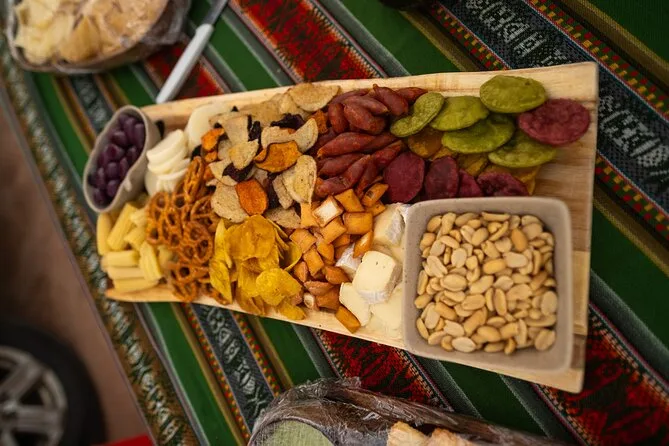 Você vai receber biscoitos, suco, pisco sour, vinho, petiscos, batatas e molhos.