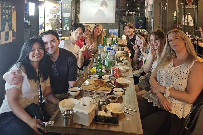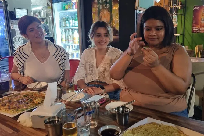 Sua noite inclui todos os jogos de bebida coreanos guiados por um local simpático chamado “Hongdae Boy”, rodadas de cerveja e soju para preparar Somaek ou Soju Bombs (com opções sem álcool se preferir), além de um kimchi seafood pancake quentinho servido na mesa enquanto você joga nos animados bares de Hongdae.