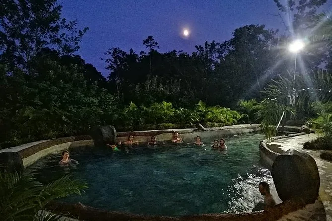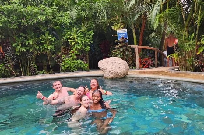 O dia inclui transporte de ida e volta do hotel na área de La Fortuna, entradas para todas as atrações incluindo acesso ao resort das águas termais, trilhas guiadas com um guia local multilíngue, almoço tradicional costa-riquenho com bebidas (mais um brinde de cacique), pausa para frutas frescas e café durante o caminho, e retorno em transporte compartilhado.