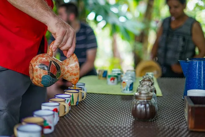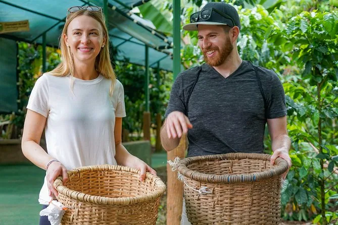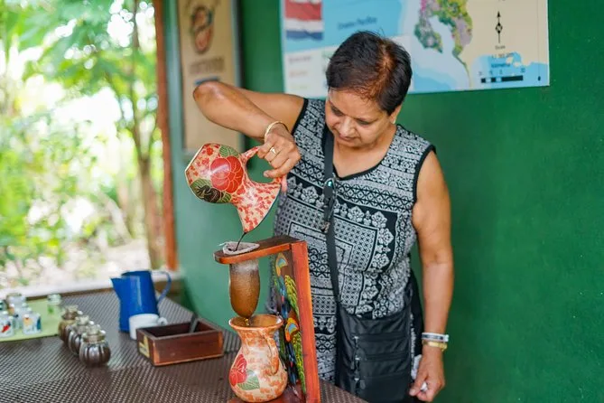 Seu dia inclui tours guiados pelos processos do café e do cacau no Don Juan Tours Arenal, em La Fortuna, oportunidades práticas para moer grãos ou fazer sua própria barra de chocolate, além de muitas degustações — desde café local fresquinho até vários tipos de chocolate costarriquenho — tudo em trilhas acessíveis, independentemente do clima.