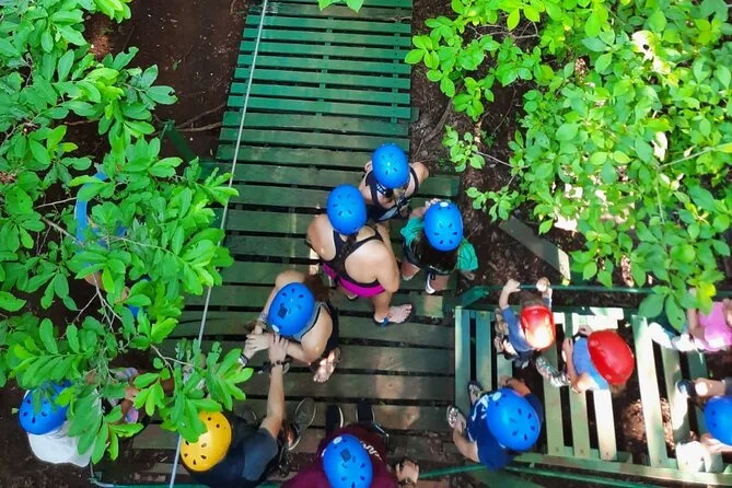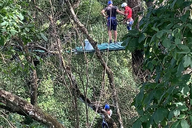 O tour inclui 7 tirolesas, uma ponte suspensa, balanço Tarzan opcional e queda livre controlada opcional.