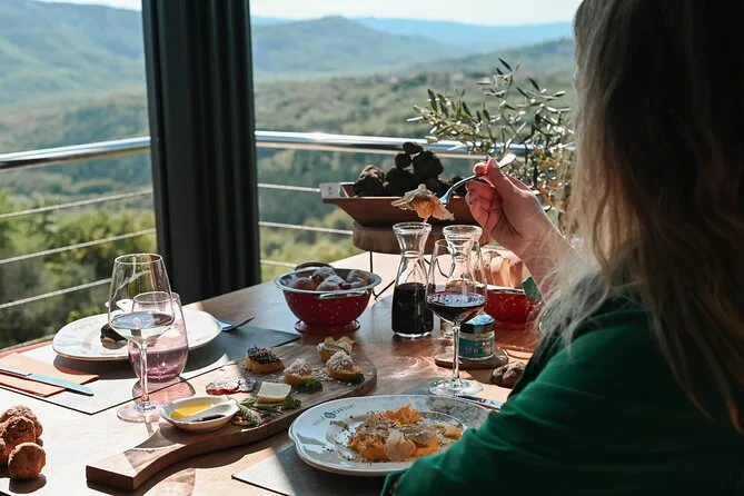 Seu dia inclui café da manhã com queijos locais, mel, salame (todos com toque de trufa), aguardentes caseiras, uma sessão de culinária ao vivo onde você ajuda a preparar ovos mexidos com trufas frescas no almoço—até a sobremesa leva um toque especial com chocolate belga e mais trufa ralada. Água mineral acompanha o vinho tinto e branco da vovó, além dos licores da casa, antes de você explorar o primeiro Museu da Trufa da Croácia—tudo isso com a hospitalidade da família Karlić perto de Motovun.