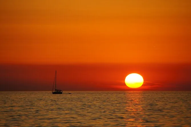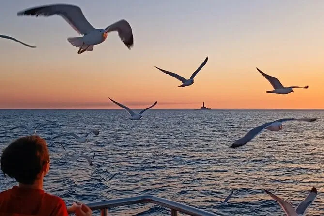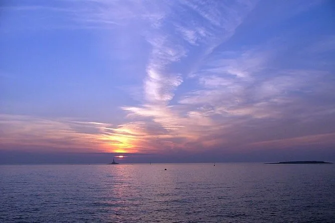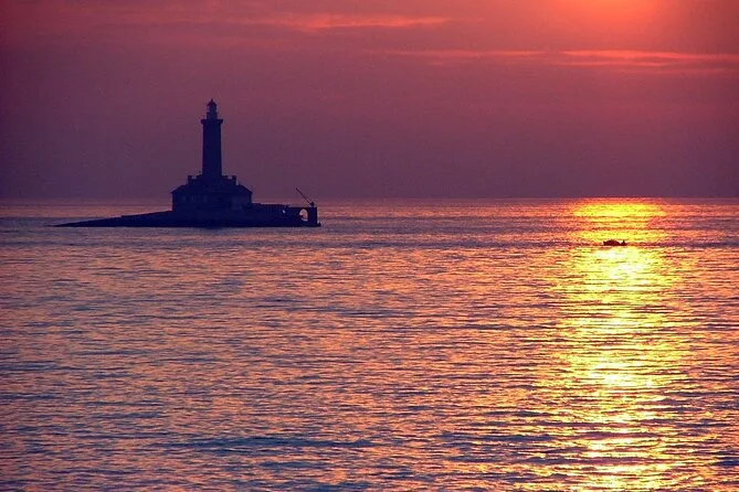 Embarque em Medulin para um passeio ao entardecer buscando golfinhos perto do Kamenjak e do farol Porer. Curta um jantar no convés — peixe, carne ou vegetariano — com bebidas incluídas, enquanto a música toca e as cores do pôr do sol mudam ao seu redor. É emocionante ver golfinhos no seu mundo enquanto você volta sob a luz que se apaga.