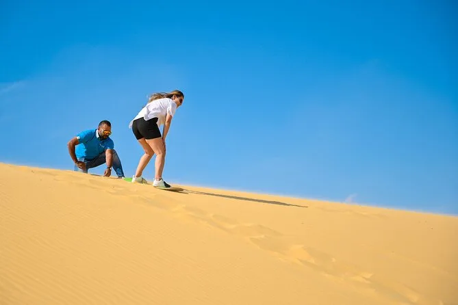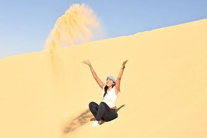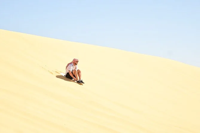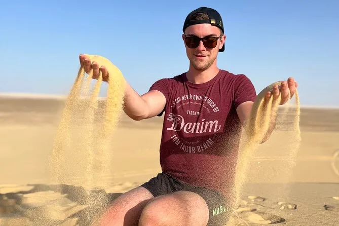 Confesso que estava meio apreensivo com a parte do passeio nas dunas. Mas não é como uma montanha-russa, é mais como… deslizar? Pulávamos sobre aquelas dunas amarelas macias no 4x4 — meu estômago deu umas voltas, mas no fim foi só risada e areia para todo lado. Nosso guia apontava formas nas pedras que pareciam animais (eu vi uma tartaruga, ele dizia que era um camelo). Depois, o sandboard foi meio desajeitado no começo — caí duas vezes e a areia entrou em lugares que eu nem sabia que existiam — mas foi divertido deixar de lado o lado sério por um tempo.
