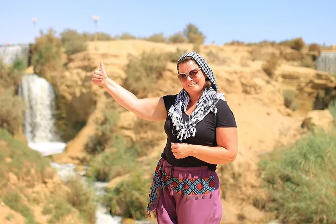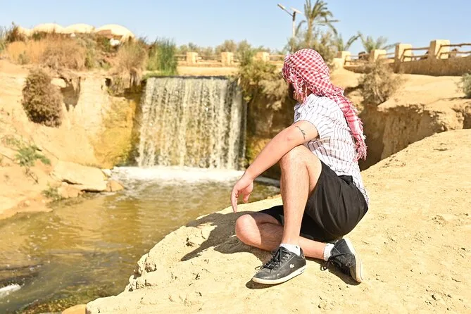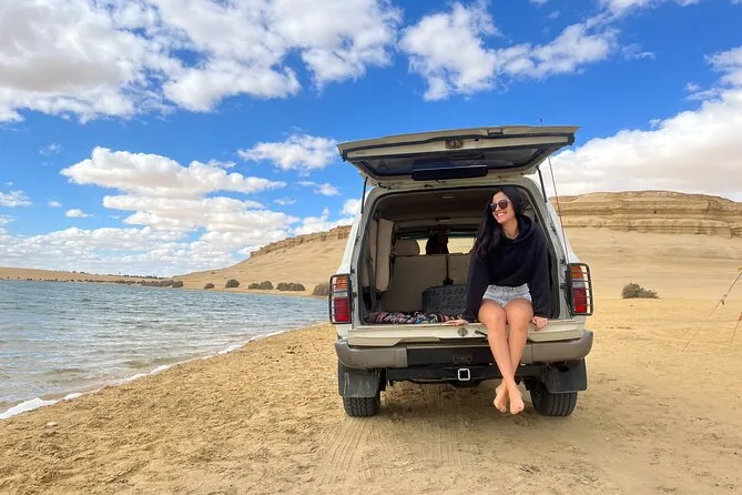 O tour inclui aventura de 4x4 nas dunas, sandboard, visita às cachoeiras de Wadi El Rayan e Magic Lake, passeio de camelo ou cavalo no lago Wadi El Rayan, paradas para fotos no Lago Qarun e na Montanha Mudawara, além de almoço no acampamento beduíno.