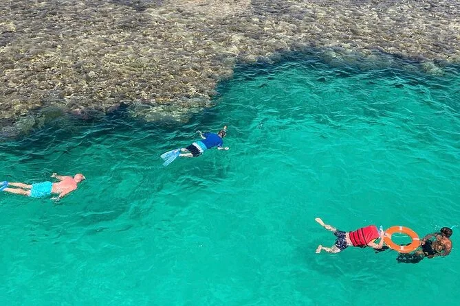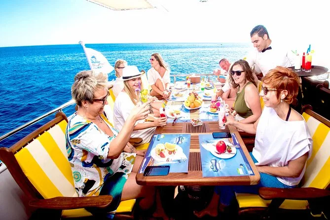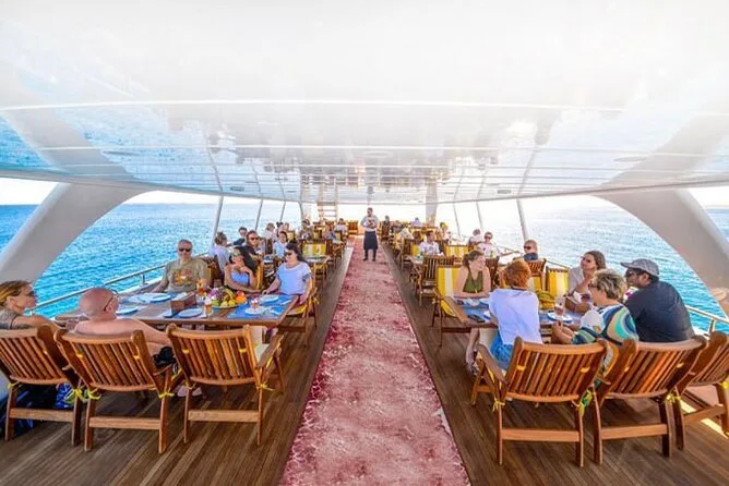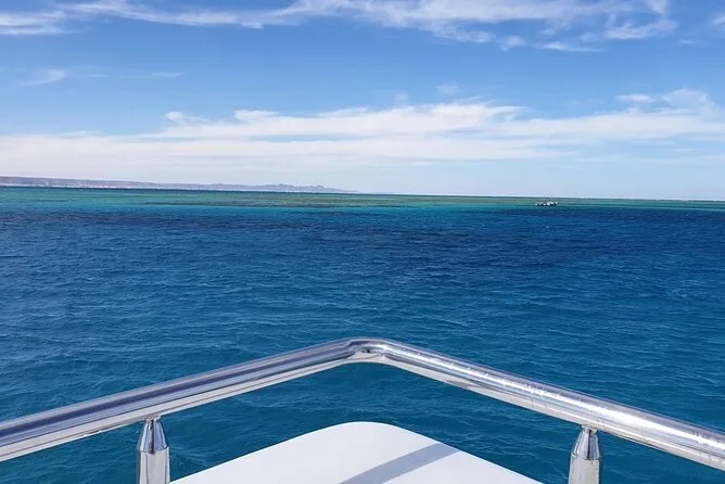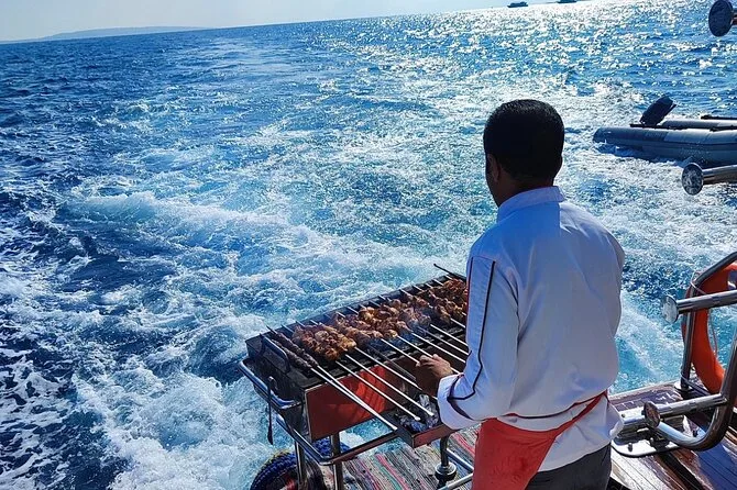 Seu dia inclui traslado do hotel em veículo com ar-condicionado em Hurghada, todas as taxas já pagas, uso do equipamento de snorkel para sessões guiadas nos melhores recifes do Mar Vermelho, bebidas quentes e não alcoólicas ilimitadas servidas por garçons onde você estiver no barco, além de um buffet generoso com especialidades locais de frutos do mar antes do retorno ao porto à tarde.