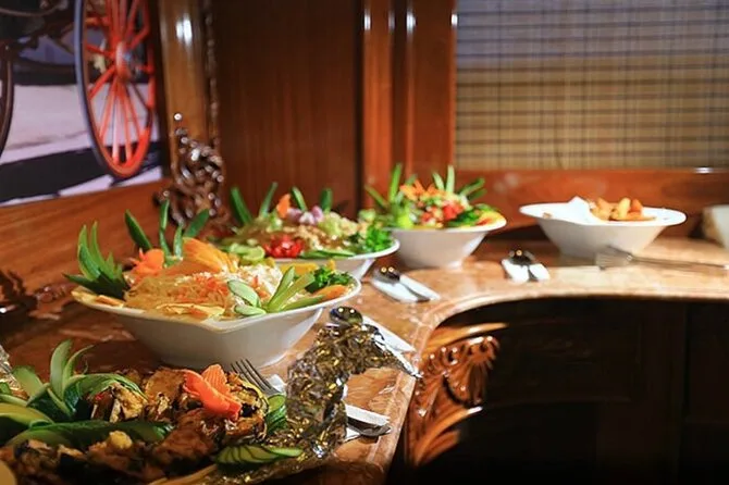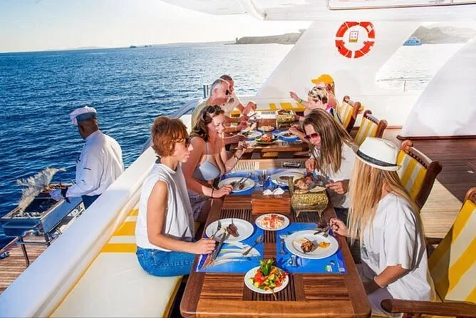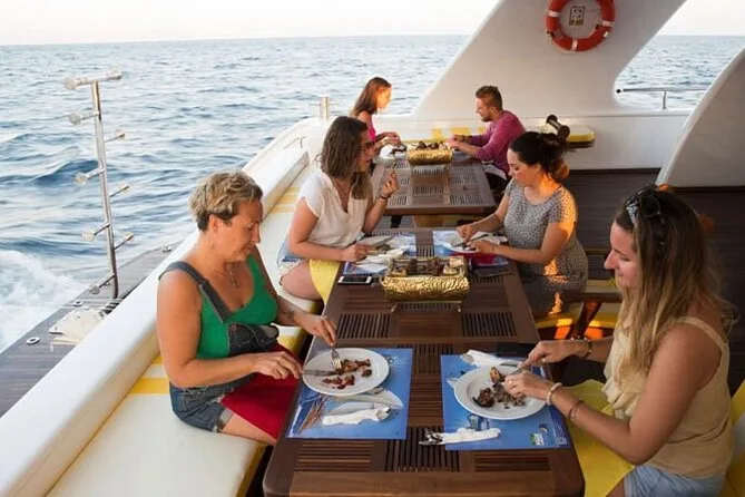 Depois seguimos para o norte, olhando a água na esperança de ver golfinhos (dessa vez não teve sorte), mas sinceramente não me importei — o sol estava quente na medida certa e tudo rolava num ritmo bem tranquilo. O almoço foi servido no deck principal, em estilo buffet: camarões grelhados com sabor defumado e adocicado, kofta egípcio mais suculento do que eu esperava, e uma salada com hortelã que até agora não saiu da minha cabeça. A galera ia e vinha entre mordidas e goles de bebidas geladas — sem pressa nenhuma.