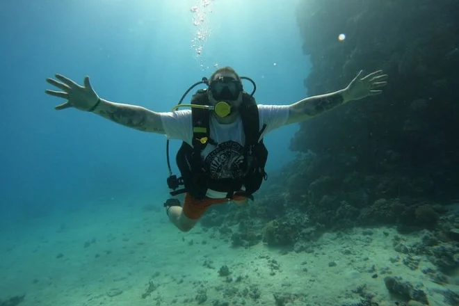 A duração varia conforme as condições, mas geralmente cada mergulho guiado dura entre 30 e 45 minutos.