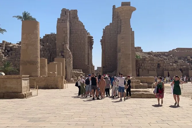 Seu dia inclui traslado do hotel em veículo com ar-condicionado e bebidas a bordo, ingressos para Templo de Karnak, Vale dos Reis, Templo de Hatshepsut, Colossos de Memnon, almoço tradicional à beira do Nilo (com opções vegetarianas), todos os impostos e taxas, além do acompanhamento de um egiptólogo experiente, com retorno confortável ao final do dia.