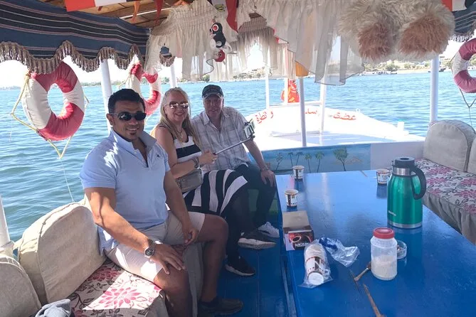 O almoço foi uma surpresa: frango grelhado com pão sírio quentinho e um tempero azedinho que até hoje não consegui identificar (Ahmed chamou de “duqqa” — acho que falei errado). Comemos à sombra perto do Nilo antes de subir em um barquinho para o passeio incluído. O rio estava calmo, com um tom esverdeado; alguém tocava música baixinho no celular. Foi bom só flutuar um pouco depois de tanto calor e história.