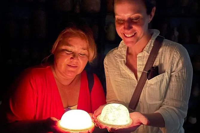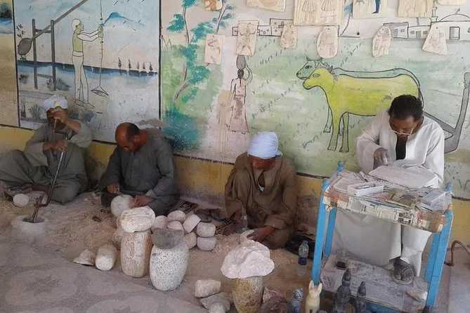 Depois, fomos conhecer uma oficina familiar de alabastro ali perto. Dá para ouvir o som suave das ferramentas batendo na pedra — artesãos moldando o material à mão, como faziam seus antepassados. Eles nos deixaram tentar polir uma peça (meu desempenho foi péssimo), mas rendeu boas risadas e mãos cheias de pó.