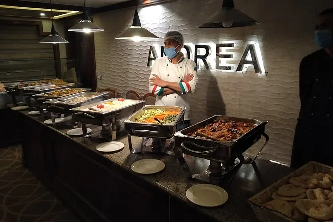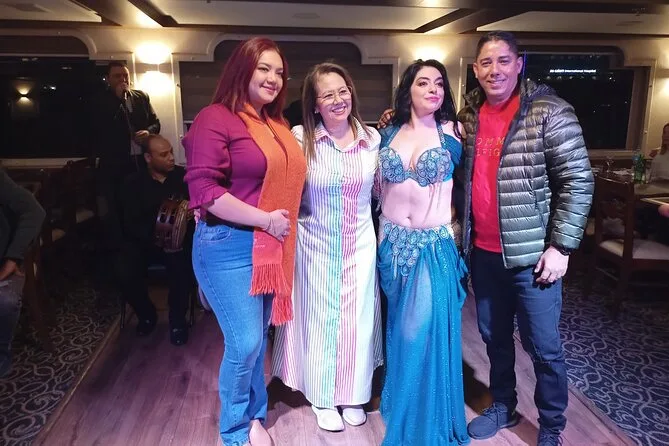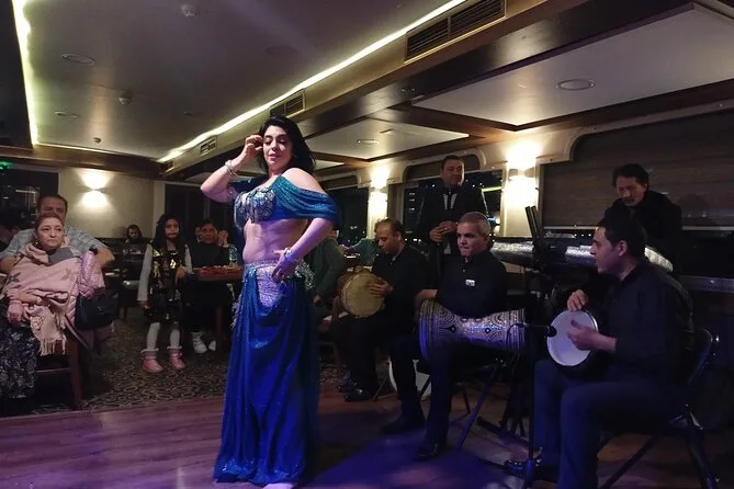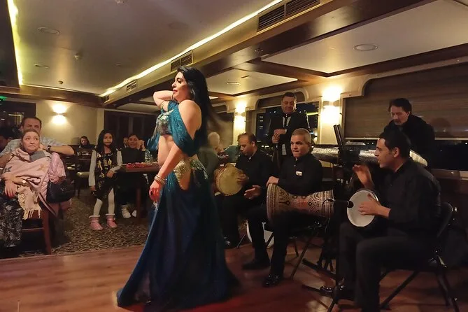 Você vai aproveitar um jantar buffet com pratos egípcios e entretenimento ao vivo, como dança do ventre e música folclórica, durante duas horas de passeio pelo rio.