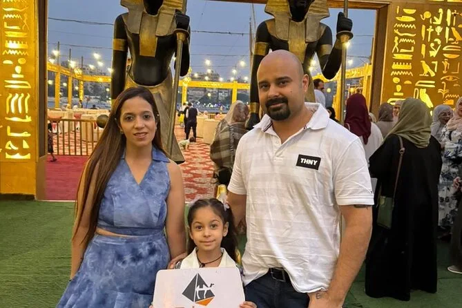 Eu não esperava que o Panorama Point fosse tão incrível quanto o nome sugere, mas uau... as três pirâmides alinhadas contra aquele céu infinito. Alguns camelos passaram atrás da gente, com os sinos tilintando. Ahmed se ofereceu para tirar uma foto nossa, mas eu quase preferi ficar observando outras famílias tentando juntar todo mundo na mesma imagem do que posar. Depois seguimos para a Grande Esfinge de Gizé. Ela é maior do que imaginei, mas também mais desgastada; o rosto dela é tão sério de perto. Ahmed contou uma história sobre Napoleão ter atirado no nariz dela (que na verdade não é verdade), e a gente riu — ele disse que cada guia tem sua versão da história.