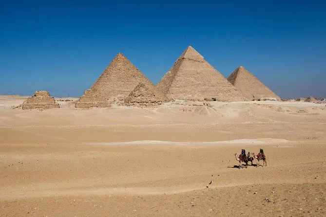 O tour inclui a Grande Pirâmide de Gizé, as pirâmides de Quéfren e Miquerinos, além da Esfinge.