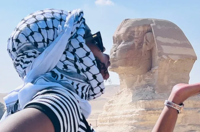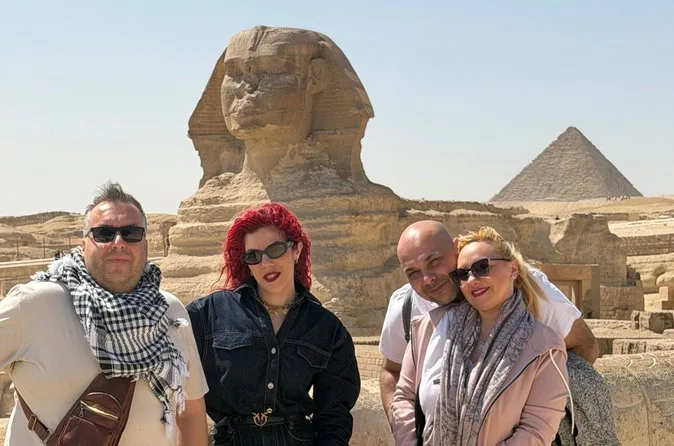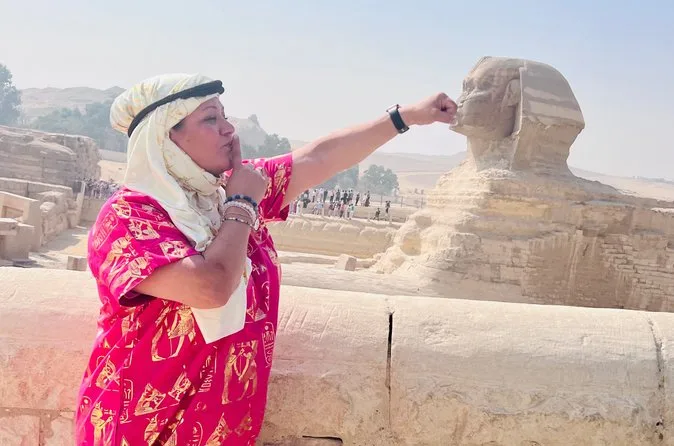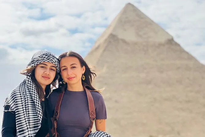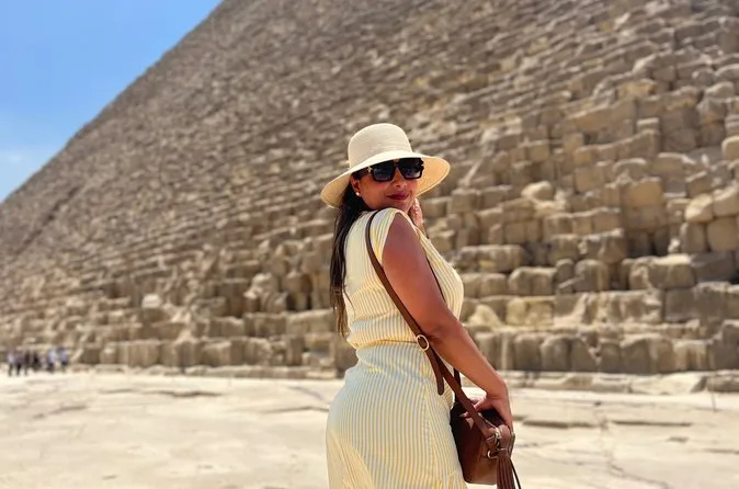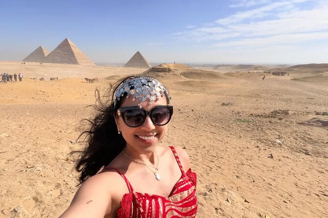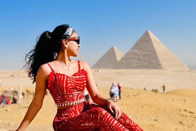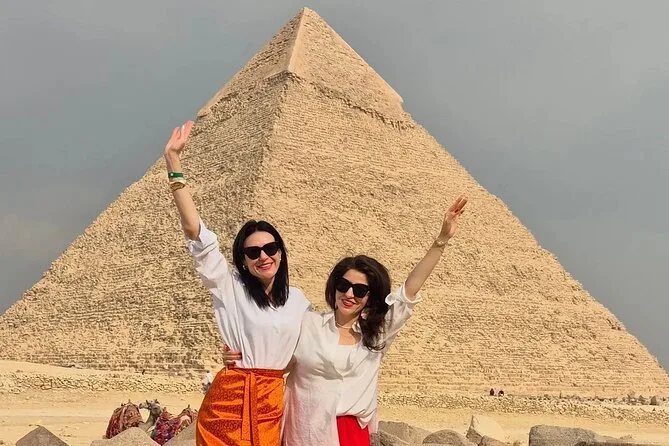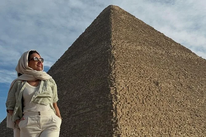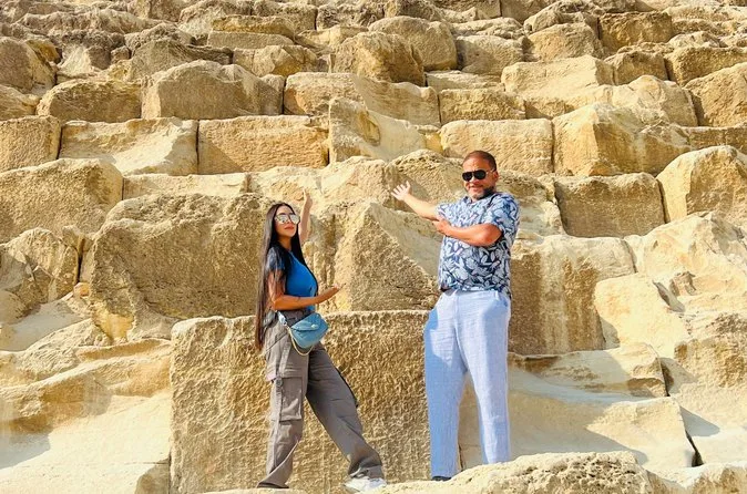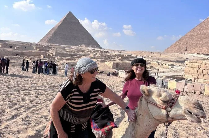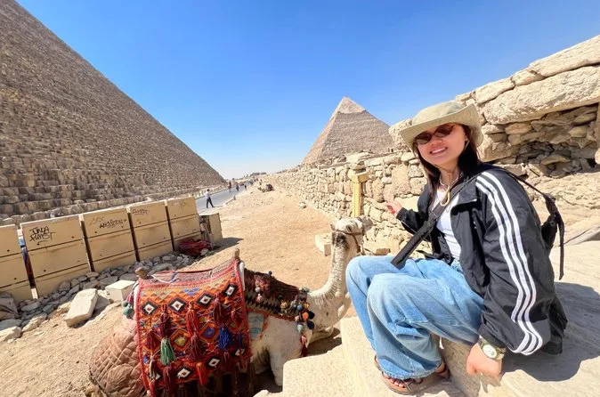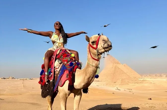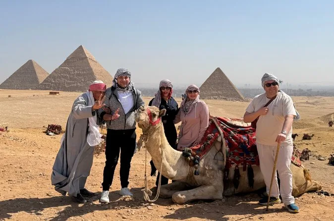 Seu dia inclui transporte privativo com ar-condicionado para busca e retorno ao hotel no Cairo ou Gizé, entrada sem fila nas Pirâmides de Gizé e na Grande Esfinge (conforme opção), acesso guiado ao interior de pirâmides selecionadas como Khufu ou Menkaure, passeio de camelo de 30 minutos pelas areias próximas aos monumentos, água mineral durante toda a visita e um almoço típico egípcio em restaurante local antes do retorno ao hotel.