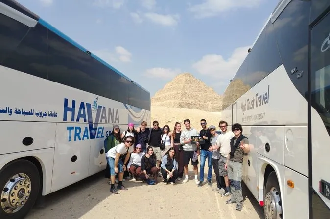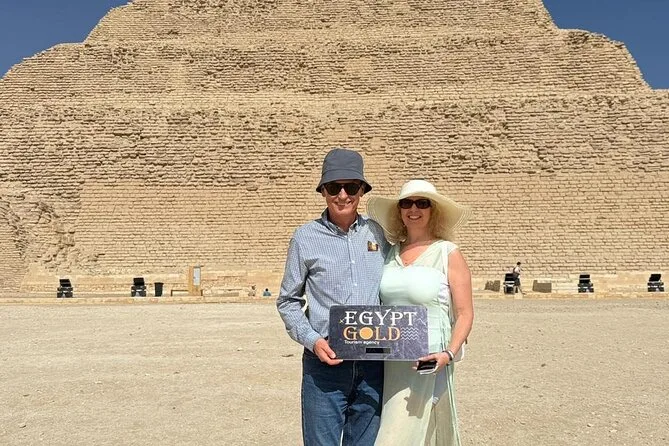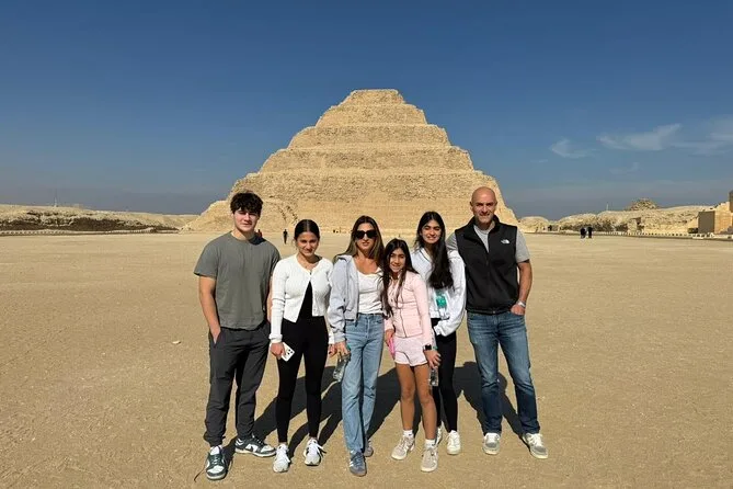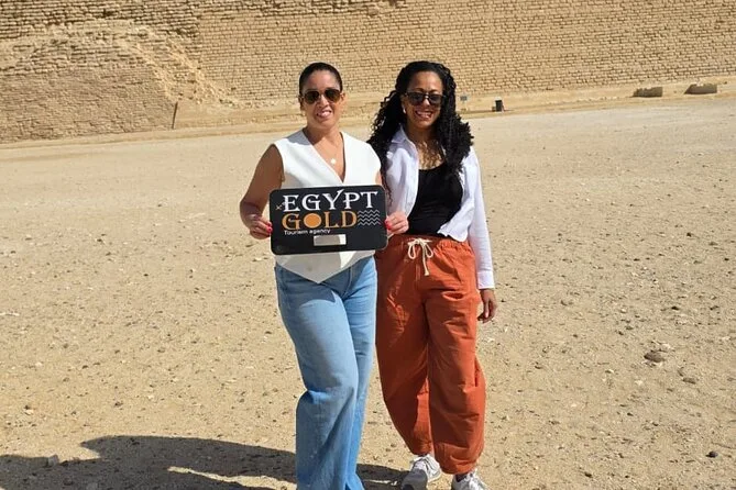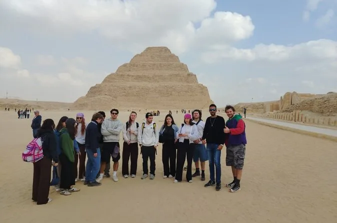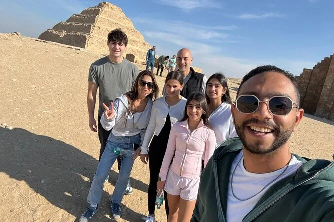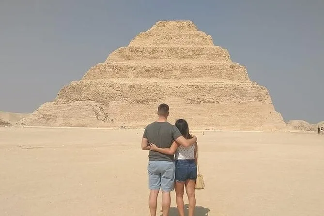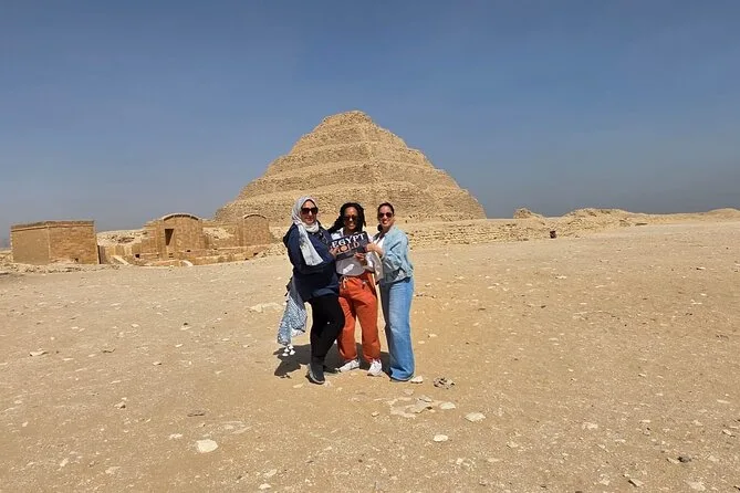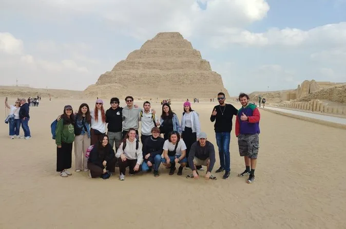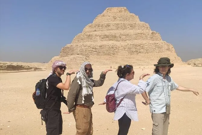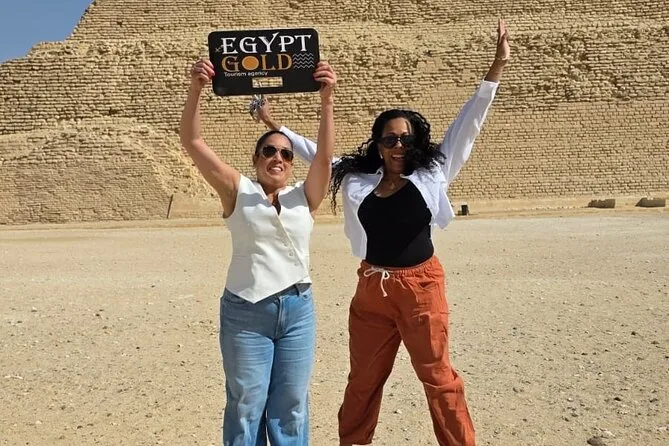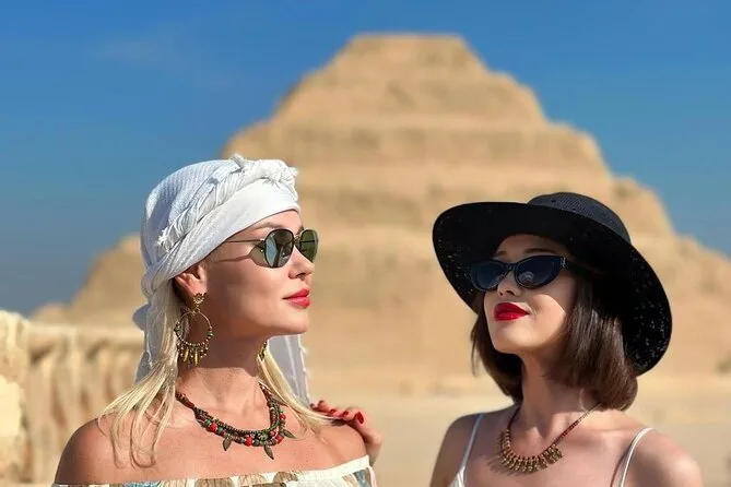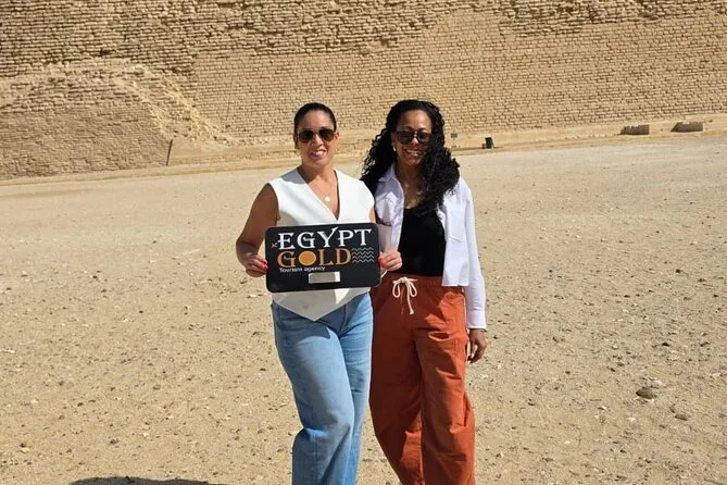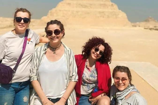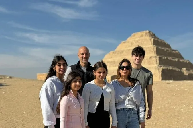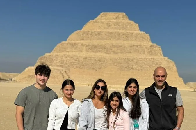 Seu dia inclui transfer privado de ida e volta do hotel no Cairo ou Giza, ingressos para as pirâmides de Saqqara e Memphis se escolhidos na reserva, além de um almoço local opcional — é só avisar seu guia se quiser incluir enquanto exploram juntos esses sítios antigos.