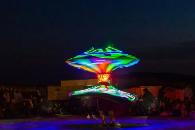 Sim, tem uma apresentação de dança Tanoura oriental e um show de fogo após o jantar.