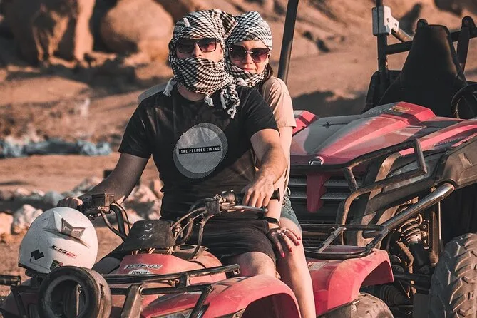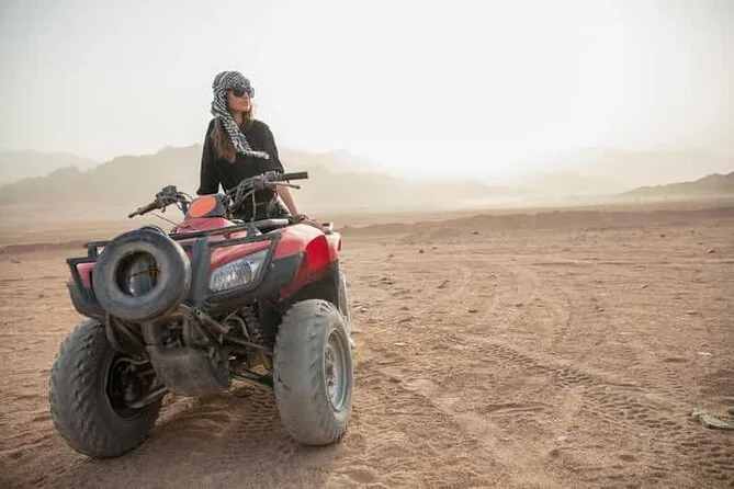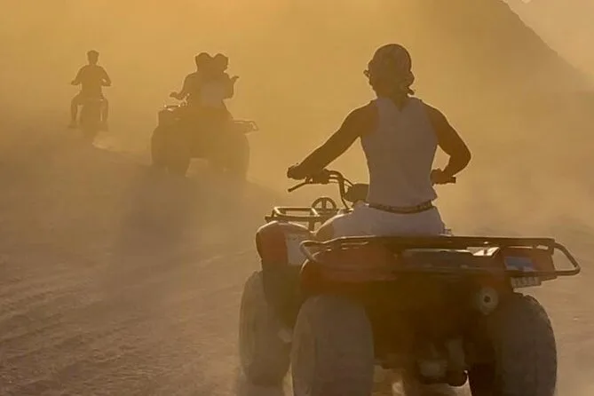 Os quadriciclos já estavam alinhados quando chegamos na beira de Sharm El Sheikh — motores roncando, poeira no ar. Nosso guia, Mahmoud, sorriu ao me entregar um capacete e falou algo sobre “massagem do Sinai” (acho que quis dizer o passeio cheio de solavancos). Eu já sentia cheiro de gasolina e areia quente antes mesmo de começarmos. Os primeiros minutos foram uma aventura — eu olhava para minha amiga para ver se ela estava rindo ou apavorada (um pouco dos dois). O deserto do Sinai meio que te engole; é mais silencioso do que eu imaginava, só o barulho dos motores e do vento.