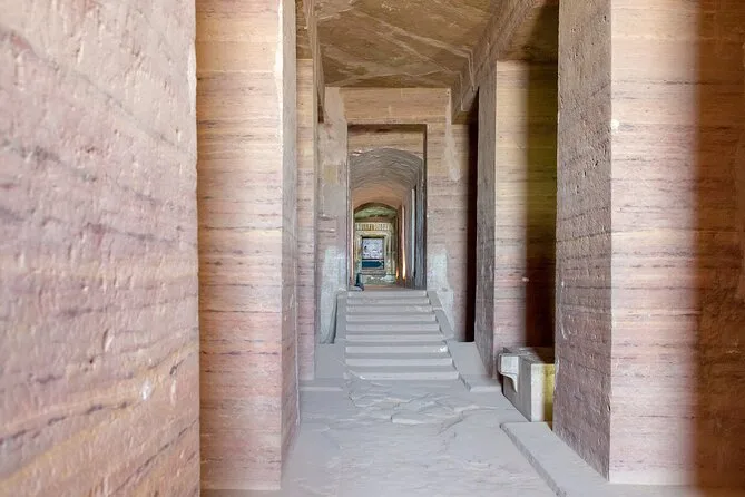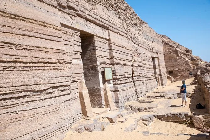 Os Túmulos dos Nobres ficam no alto de uma colina rochosa — 42 túmulos esculpidos diretamente na pedra, alguns datando da era faraônica, outros da época em que os gregos governavam aqui. Subimos uma longa escadaria (sentimos cada degrau!), mas vale a pena para aqueles primeiros vislumbres do interior. Nosso guia apontava cenas pintadas nas paredes — vida cotidiana, rituais, até cores desbotadas que ainda parecem rosadas depois de tantos séculos. Visitamos três túmulos: Mekho e Sabini, Siranbout 1 e Siranbout 2. Cada um tinha sua própria história, que nosso guia explicou com verdadeira paixão.