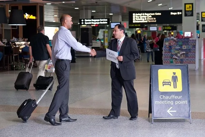 Seu motorista estará esperando do lado de fora do saguão de desembarque com uma placa com seu nome.