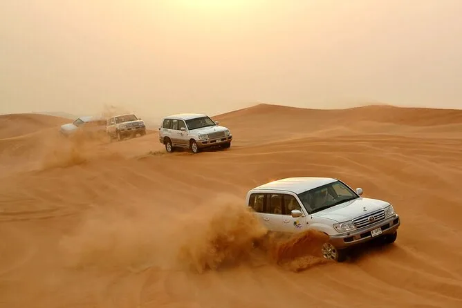 Você vai acelerar pelas dunas douradas perto de Maleha em um 4x4 com guia local experiente, conhecer camelos de perto e assistir a um show de falcões enquanto o pôr do sol colore a areia. No acampamento, experimente café árabe, prove shawarma ou falafel, veja apresentações ao vivo — e talvez se surpreenda com a quantidade de estrelas no céu.