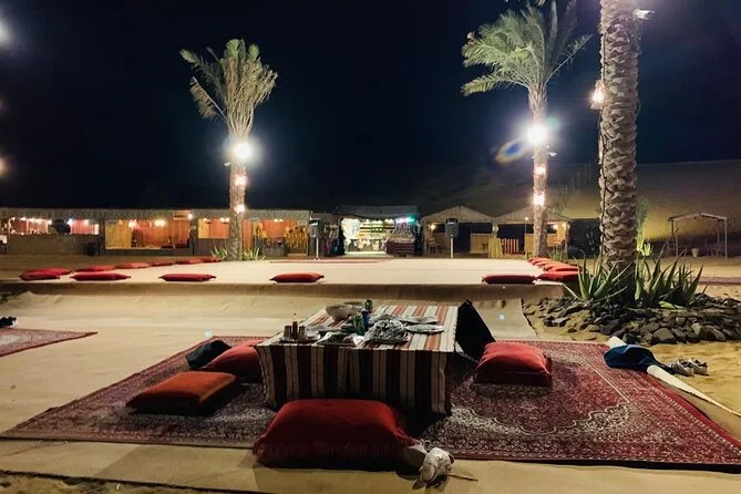 Sua noite inclui traslado do hotel em Land Cruiser 4x4 com ar-condicionado, dune bashing perto de Maleha com paradas para fotos, visita a fazenda de camelos e show de falcões com interação, tempo para fotos do pôr do sol no acampamento com café árabe e tâmaras na chegada. Você poderá experimentar sandboard (com custo extra), passeios curtos de camelo, tatuagens de henna e narguilés antes de aproveitar bebidas à vontade e jantar com churrasco, com opções vegetarianas e não vegetarianas — tudo finalizado com dança Tanoura, show de fogo e dança do ventre sob o céu aberto do deserto.