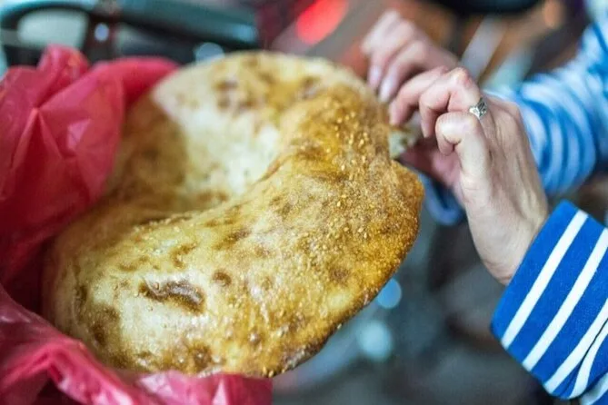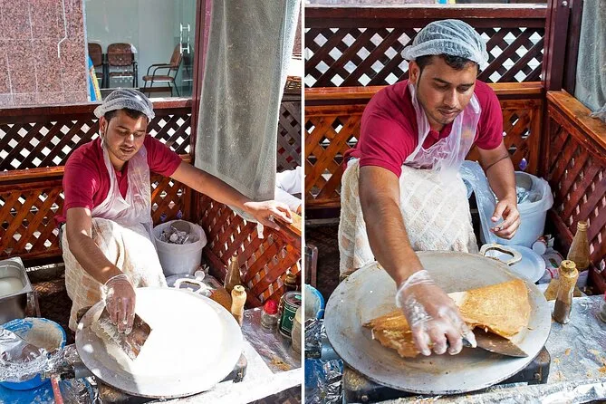 Seu dia inclui caminhadas guiadas pelo bairro histórico de Al Fahidi e pelos souks, com várias paradas para provar comidas de rua como falafel, shawarma e kunafa, além de chá árabe ou suco; água engarrafada também é fornecida; você vai atravessar o Dubai Creek no tradicional barco abra; o guia profissional e licenciado conta histórias durante todo o passeio; todas as áreas são acessíveis para cadeirantes, garantindo conforto para todos.