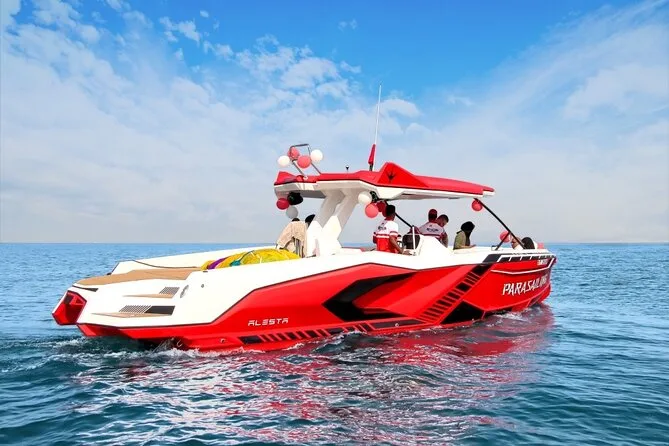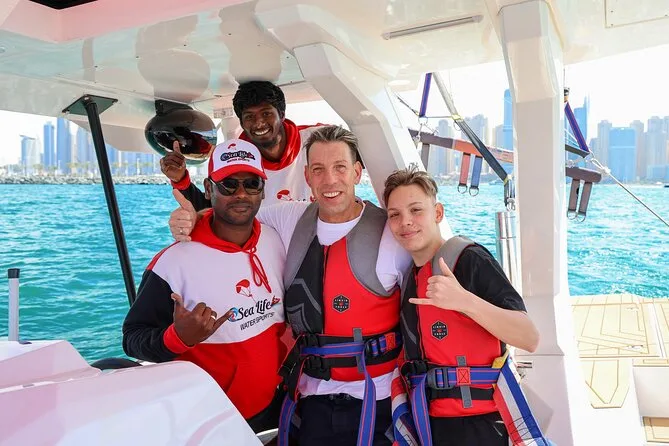 Você sai de barco do Dubai Harbour e voa alto sobre Palm Jumeirah e Praia de JBR no parasailing. Com equipe local e fotos grátis no seu celular, é só aproveitar a vista da cidade — mesmo com as mãos tremendo um pouco.