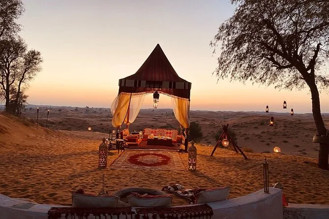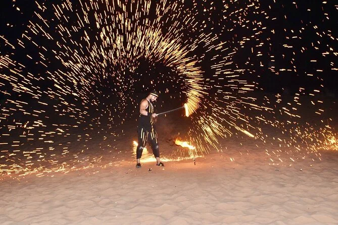 Sua noite inclui transporte 4x4 com motorista-guia local para buscar em qualquer lugar de Ras Al Khaimah; todas as sessões de dune bashing; passeios de camelo; sandboard; água mineral, café árabe doce e tâmaras na chegada; jantar completo com churrasco em buffet; pintura de henna; entretenimento ao vivo com dança do ventre e shows de fogo; e retorno ao hotel após o anoitecer.
