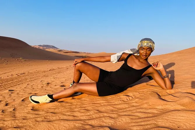 Depois veio o dune bashing — que é basicamente acelerar morro acima e morro abaixo em um 4x4, enquanto todo mundo no carro alterna entre risadinhas nervosas e gritos de susto. Khalid parecia curtir cada segundo; em um momento ele colocou uma música árabe alta e gritou “segura firme!” enquanto escorregávamos de lado em uma ladeira. Minhas mãos suavam de tanto segurar o banco, mas era uma diversão estranha. Paramos para fotos bem quando o sol começava a se pôr — um silêncio tomou conta, só quebrado pelo vento passando na grama. Também tentei sandboard (não foi nada elegante) e acabei com areia até dentro do sapato.