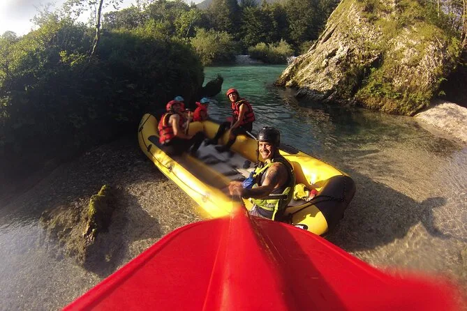 O Rio Soča tem uma cor inacreditável, um azul-esverdeado que parece tinta aquarela derramada na água. Começamos por um trecho tranquilo — nada muito agitado — perfeito para nosso grupo. Luka animava o passeio com piadas de pirata e competições de respingos. Em uma curva, ele apontou um lugar onde os locais às vezes pulam; deixou as crianças mais corajosas (e os adultos também) experimentarem. A água estava fria, mas nada chocante — só o suficiente para despertar. Entre remar e deixar o bote flutuar, tivemos várias chances de nadar ou simplesmente boiar olhando para as montanhas. No fim, todo mundo sorria — até nosso filho do meio, que é mais tímido, estava falando sobre “comandar como um verdadeiro capitão”.