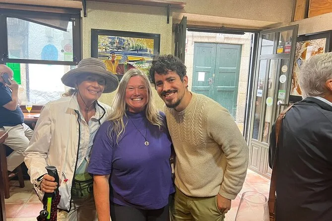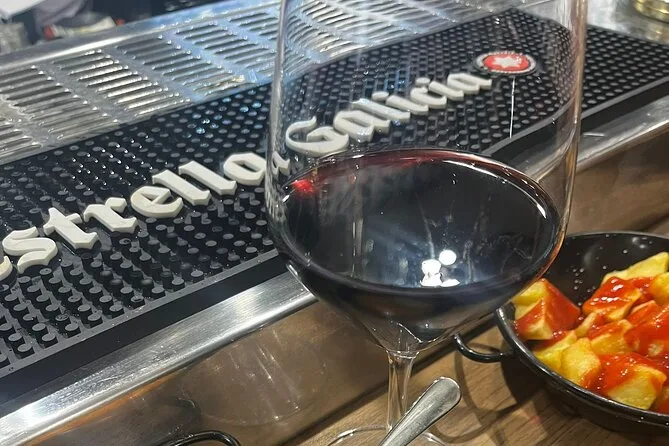 Na última parada, vinha uma música ao vivo de algum lugar atrás do balcão — guitarra e alguém cantando em galego, que soava mais suave que o espanhol. Pedimos a terceira bebida (desta vez escolhi vinho) e ficamos só ouvindo um pouco. Fiquei pensando como tudo tem um sabor diferente aqui; até o pão tinha uma crosta crocante que não se encontra em casa. A noite toda ficou meio solta, com gente entrando e saindo, histórias se misturando com petiscos e goles. Depois de um tempo, nem parecia um tour... mais como ser convidado para um rolê de alguém da cidade.