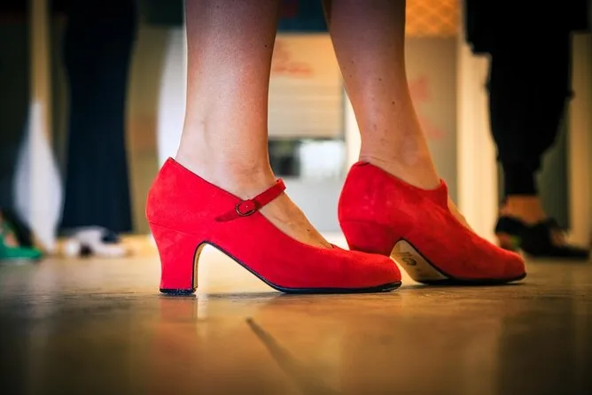 Alguém está amarrando um xale vermelho nos meus ombros—acho que é a Eva, embora o estúdio já esteja cheio de nomes e risadas. O chão está mais frio do que eu imaginava, mesmo com meus tênis. Estamos naquela sala iluminada em Triana, cheia de espelhos, e Eva bate um ritmo que é ao mesmo tempo firme e acolhedor. Ela comenta que o flamenco está “no sangue” dali. Não sei se vai entrar no meu em só uma hora, mas ela sorri como se fosse possível.