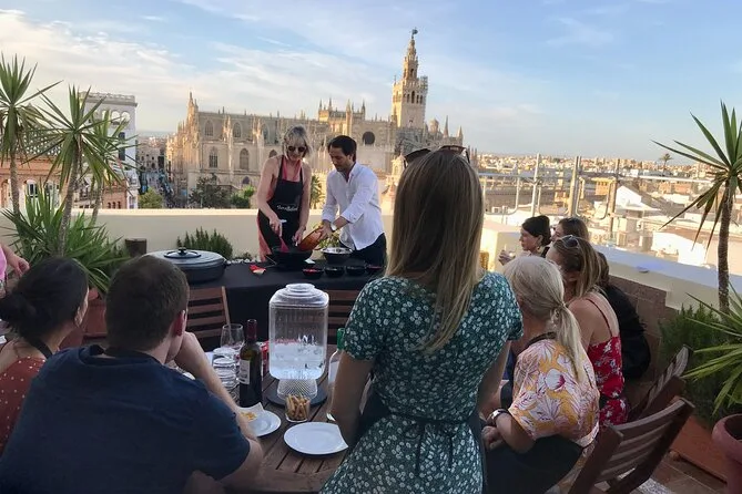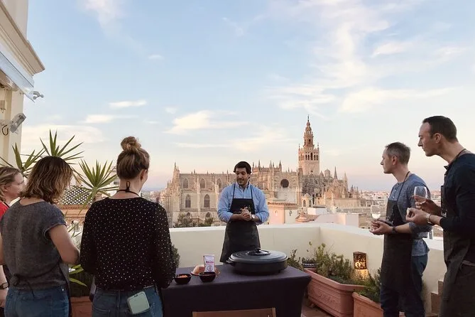 Sua tarde começa com drinks de boas-vindas na chegada, petiscos deliciosos para abrir o apetite, e uma aula prática com uma chef local que fala inglês, enquanto preparam juntos uma paella valenciana original de frango e legumes numa cobertura exclusiva em Sevilha. Você também vai saborear sangria artesanal marinada durante a noite, participar de uma sessão de perguntas e respostas de 30 minutos com vista para a catedral, levar receitas impressas para casa e terminar com um presente especial antes de voltar para a cidade.